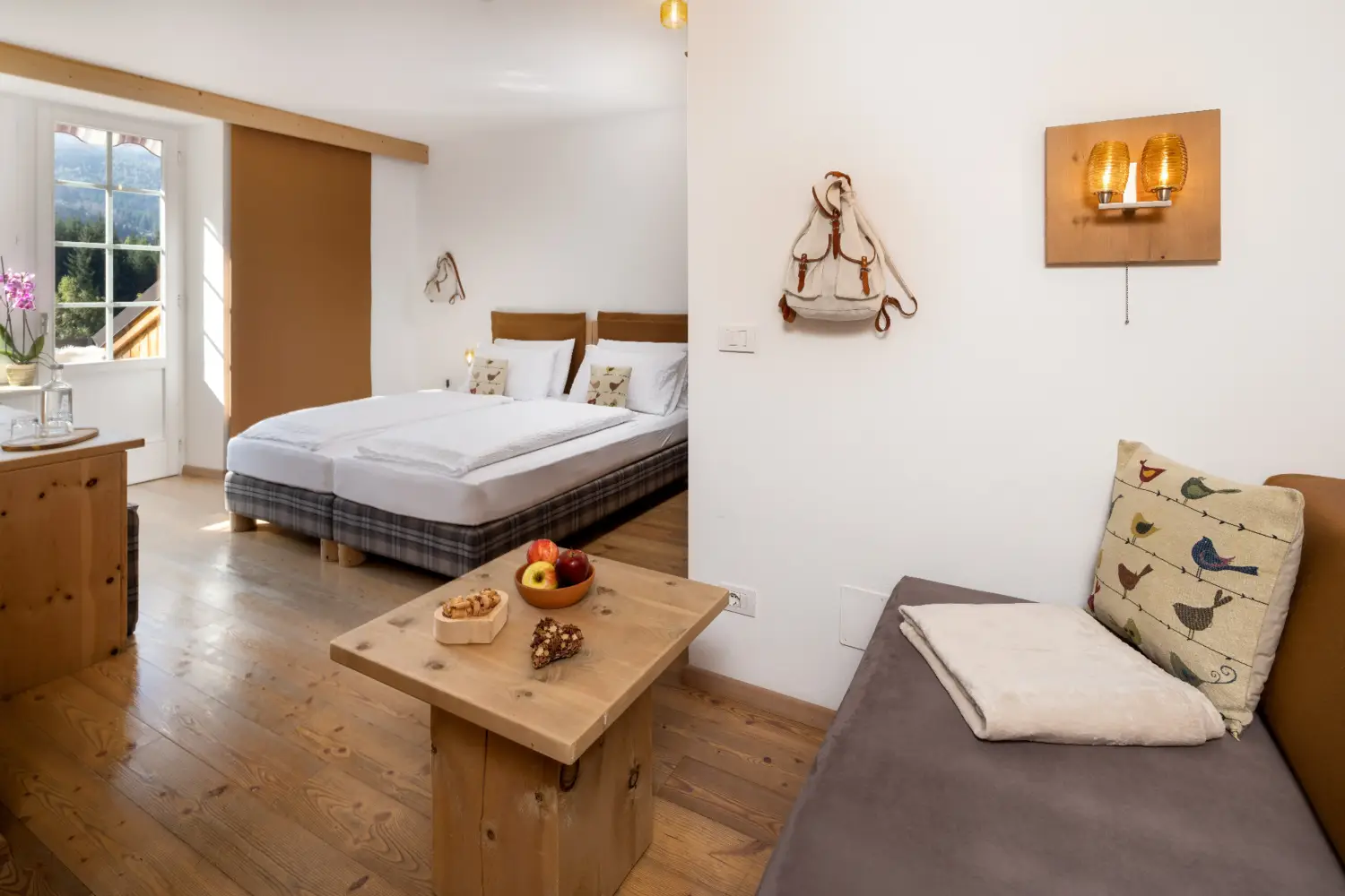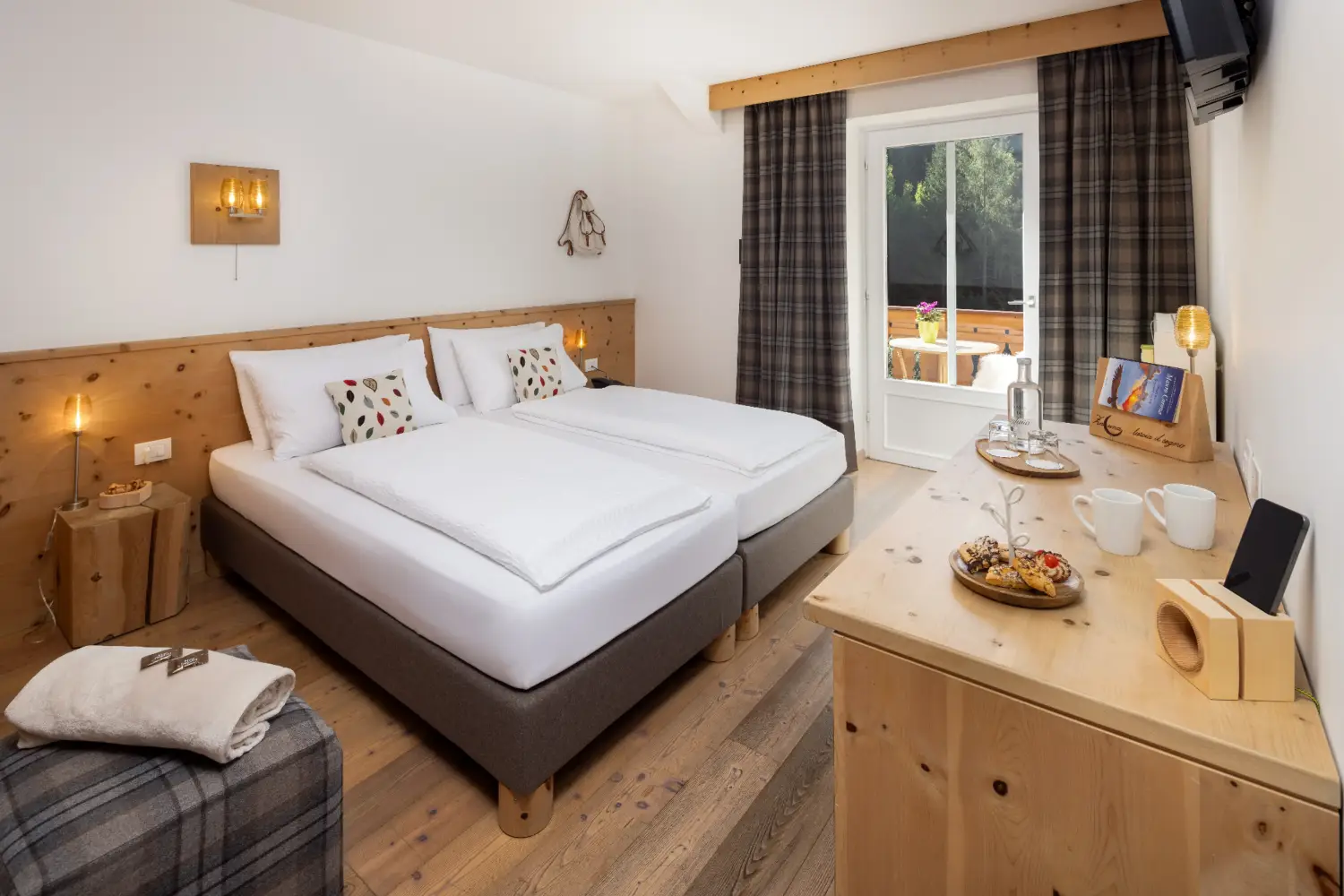 13 Zimmer sind mit CIRMOLO-HOLZmöbeln ausgestattet, einer Essenz, die Ihnen beim Entspannen und beim Schlafen hilft. Tatsächlich wurden in den gesamten Alpen Babybetten aus diesem Holz gebaut. Lärchenböden und Walkstoffe vervollständigen unsere Zimmer, die fast alle über einen Balkon mit Blick auf die zauberhaften umliegenden Wälder verfügen. Ein erholsamer Urlaub voller Aufmerksamkeit erwartet Sie…