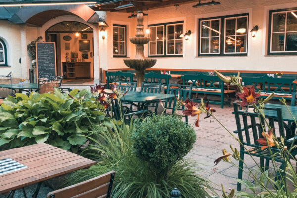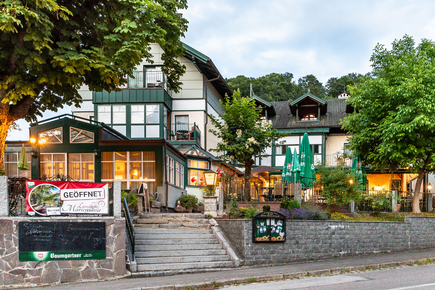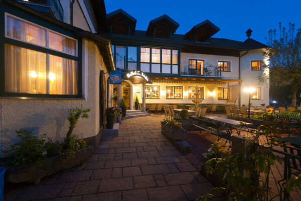 das Landhotel Mariensäule in Wernstein am Inn. Besonders beliebt ist der Gastgarten mit Blick auf das unvergleichliche Ambiente am Inn und Platz für rund 250 Gäste. Gaststube und Saal verfügen über weitere 200 Sitzplätze. Ideal für Familien- und Firmenfeiern, Hochzeiten oder Seminare und Workshops.