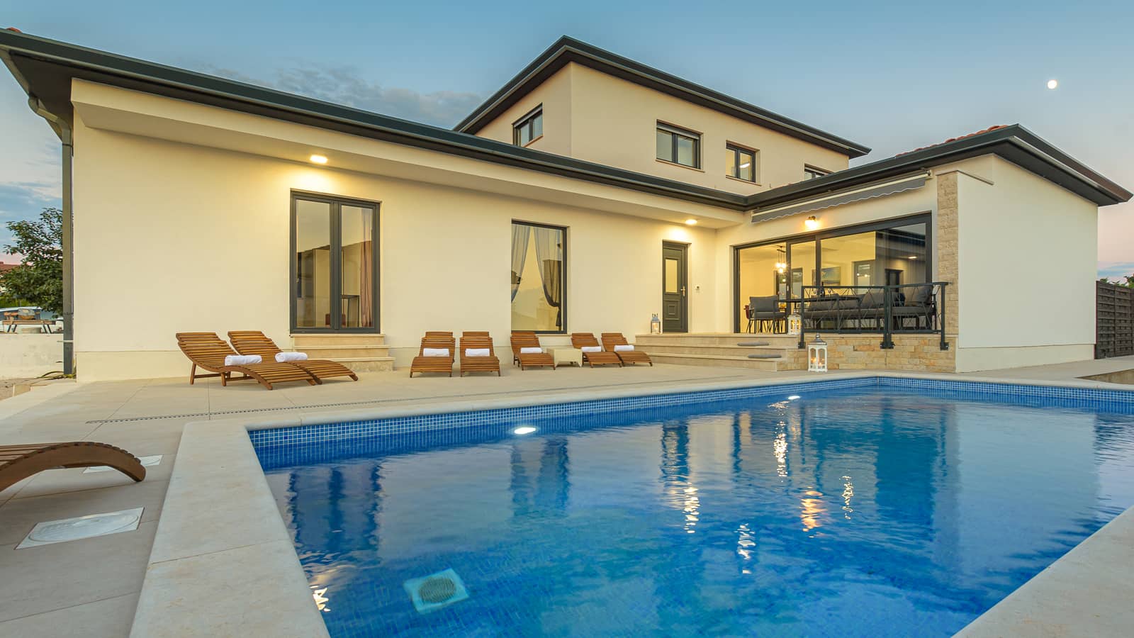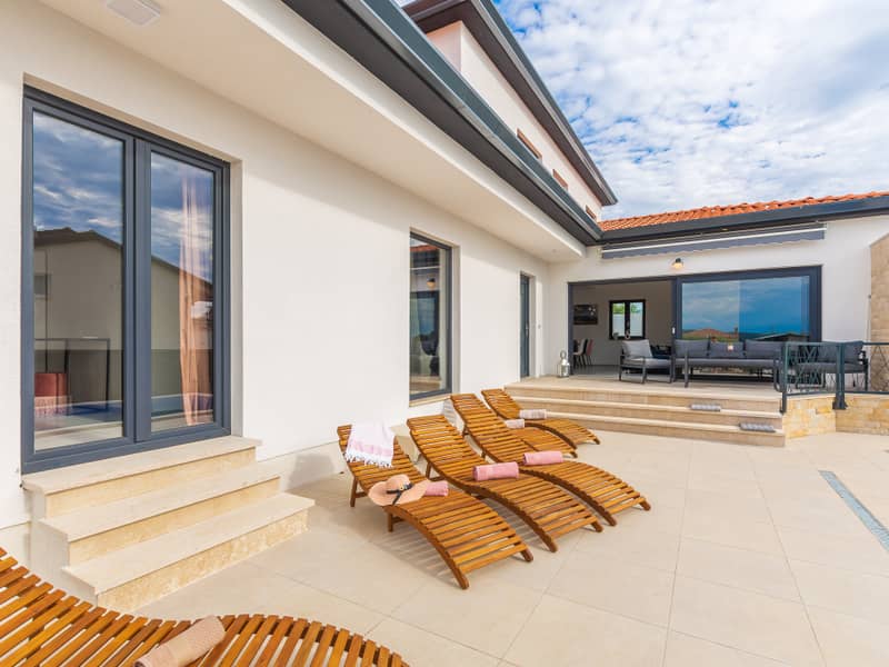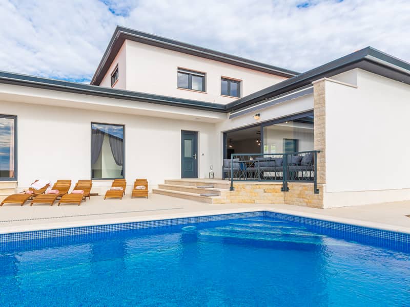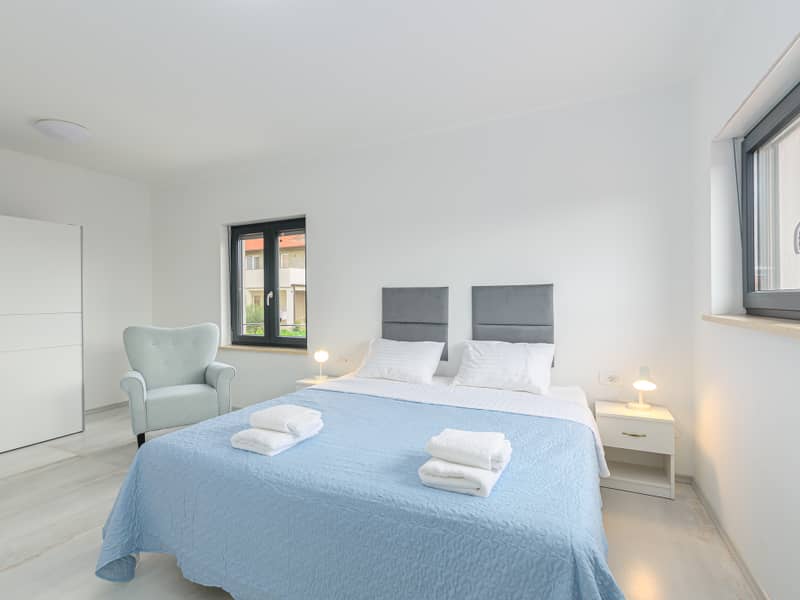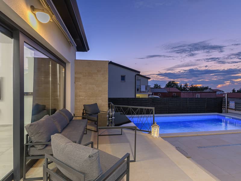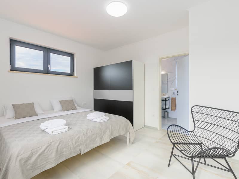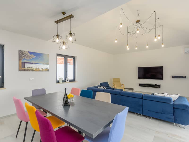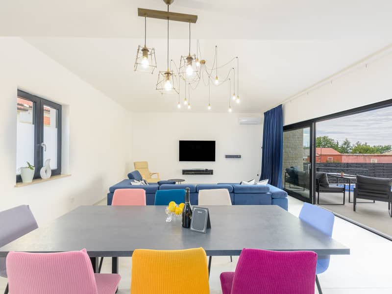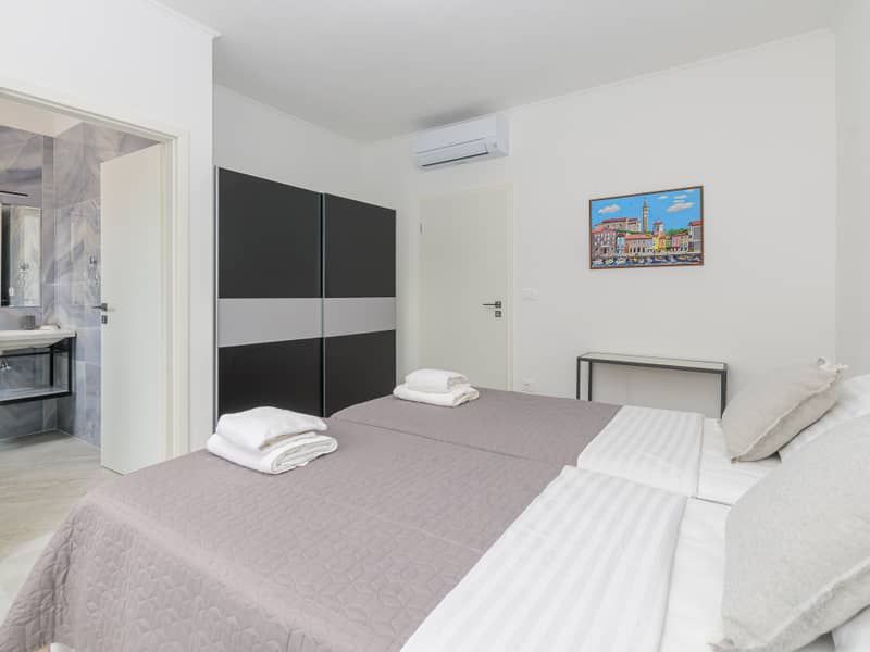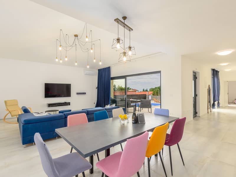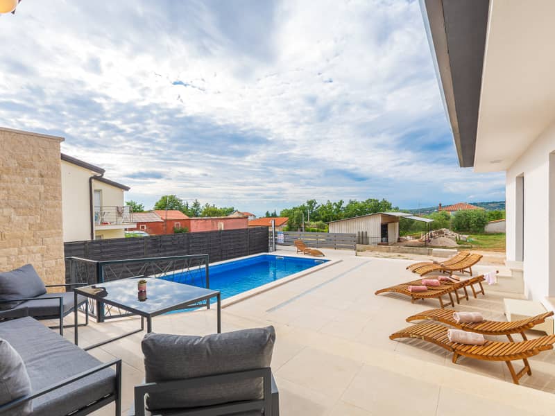 Die Villa Eivissa liegt im kleinen Ort Plovanija am Rande der kroatischen Region Istrien, unter der Verwaltung der historischen Stadt Buje. Die Villa bietet Platz für bis zu 8 Personen + 1 Kleinkind. Im Erdgeschoss befinden sich eine voll ausgestattete Küche, ein Essbereich, ein Wohnzimmer, zwei Schlafzimmer mit eigenem Bad, ein Abstellraum und ein WC. Im ersten Stock gibt es zwei weitere Schlafzimmer mit privaten Bädern. Alle Zimmer sind klimatisiert.
